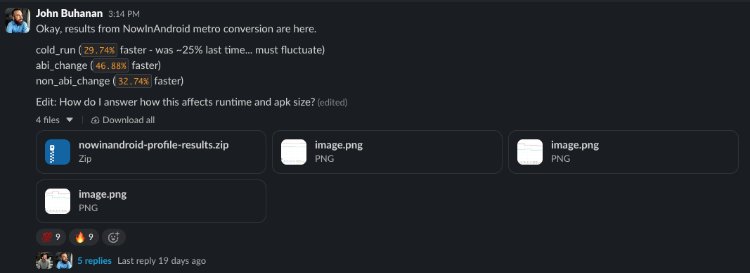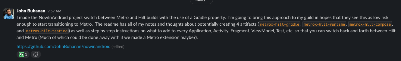 I have been researching Metro for a while now and I am in love with it. All of the build speed and runtime performance improvements reported by the companies that migrate and the beautiful syntax won me over quick, and I was curious what improvements it would have over a project that used Hilt, so I started by converting the famous "NowInAndroid" app from Hilt to Metro and did some build speed measurements which I happily reported back to Zac.