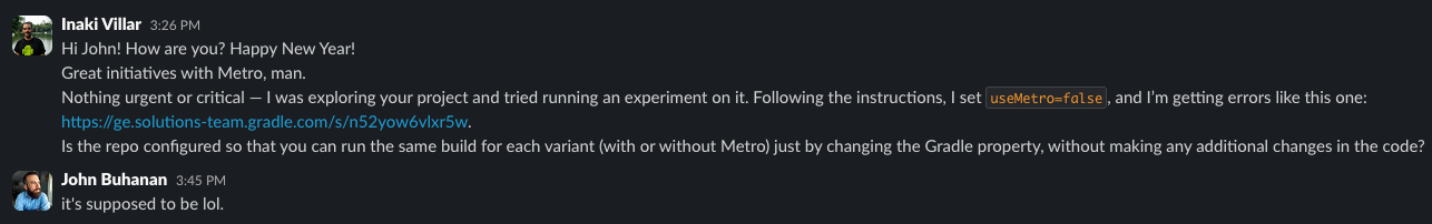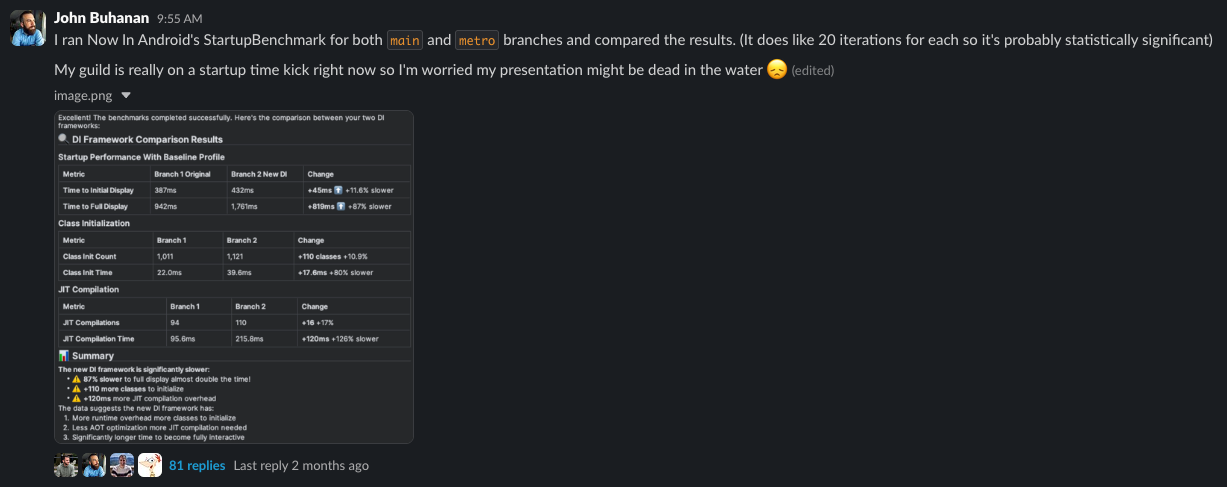 Zac pushed a fix before end of day though making startup equivalent to other DI (because apparently he is superman) and he developed tests and infrastructure to make sure there were no buildtime/runtime regressions. Recently he pushed the equivalent of dagger's fastInit and people are reporting that now Metro has faster startups than other DI frameworks.